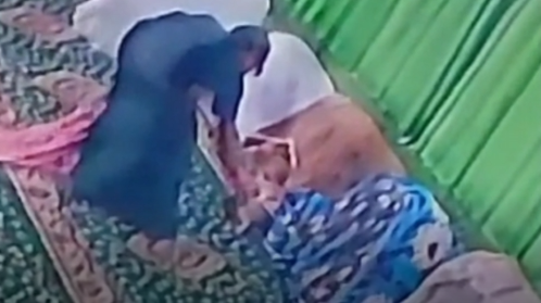 Terlihat seorang pria berperawakan kurus mengenakan baju dan kain hitam menuju barisan sholat perempuan. Dengan menggunakan mukena ungu, pria tersebut dengan santai menarik sebuah tas hingga ke belakang dan kemudian perlahan keluar dari masjid.