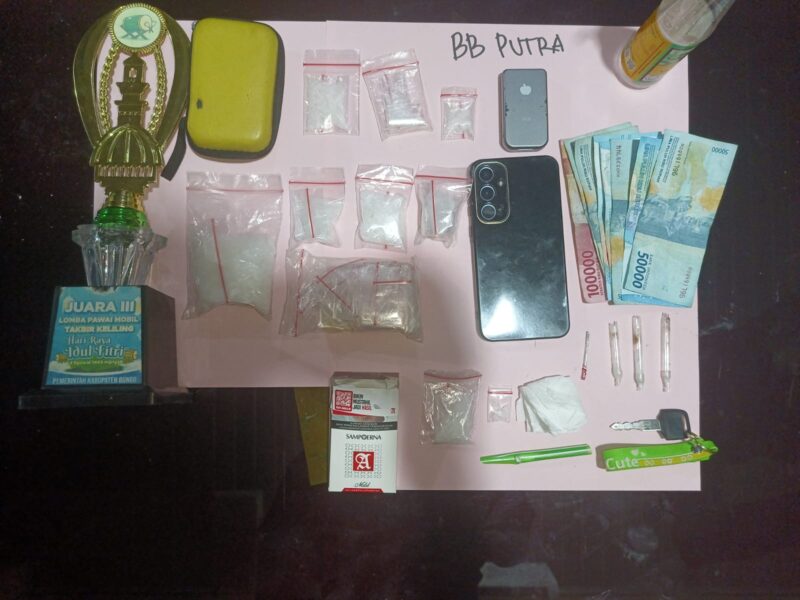 Dari hasil penggeledahan, petugas menemukan barang bukti berupa paket sabu siap edar dengan berat total 96,09 gram. Polisi juga menyita sejumlah barang bukti lainnya seperti dompet, sebuah piala, dua unit telepon genggam, satu unit sepeda motor, uang tunai Rp450 ribu, serta perlengkapan pengguna sabu.