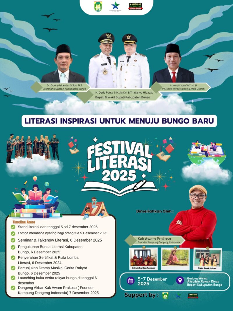 Muara Bungo, Bungotv.co – Dinas Perpustakaan dan Arsip Daerah kabupaten Bungo akan Mengadakan Lomba membaca nyaring pada tanggal 5 desember kemudian Guna meningkatkan minat baca masyarakat, Kemudian Dilanjutkan pada sabtu 6 Desember Melaksanakan Acara Puncak Festival Literasi, Puncak acara kegiatan festival literasi sejaligus pelantikan bunda LITERASI, dan penyerahan piala piagam pemenang lomba kegiatan bidang perpustakaan DAK Non Fisik tahun 2025.